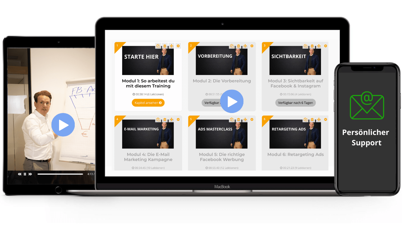 Das wöchentliche Videotraining dauert 2 bis 3 Stunden. Die gelernten Inhalte solltest du dann für deine eigene Kampagne anwenden. Abhängig von deinem derzeitigen Wissenstand und der Höhe deines Werbebudgets, benötigst du zusätzliche 2-4 Stunden in der Woche, um deine Kampagne auszuwerten und zu optimieren.